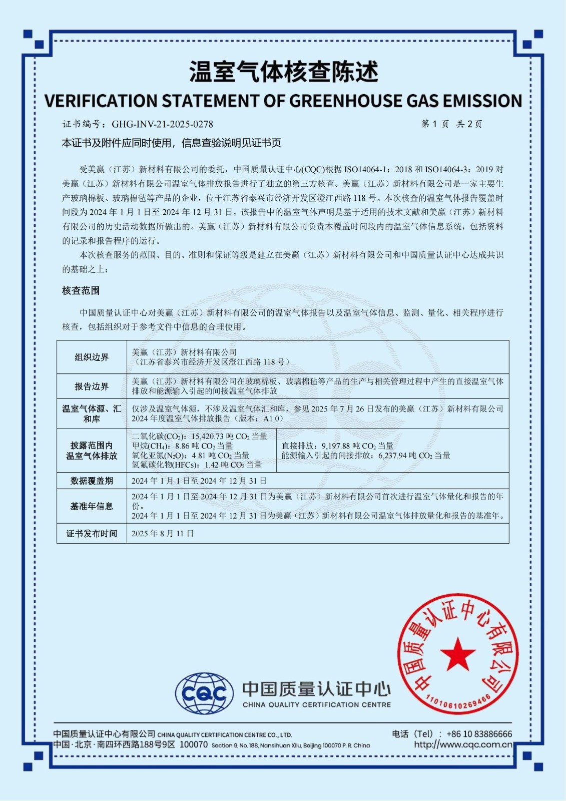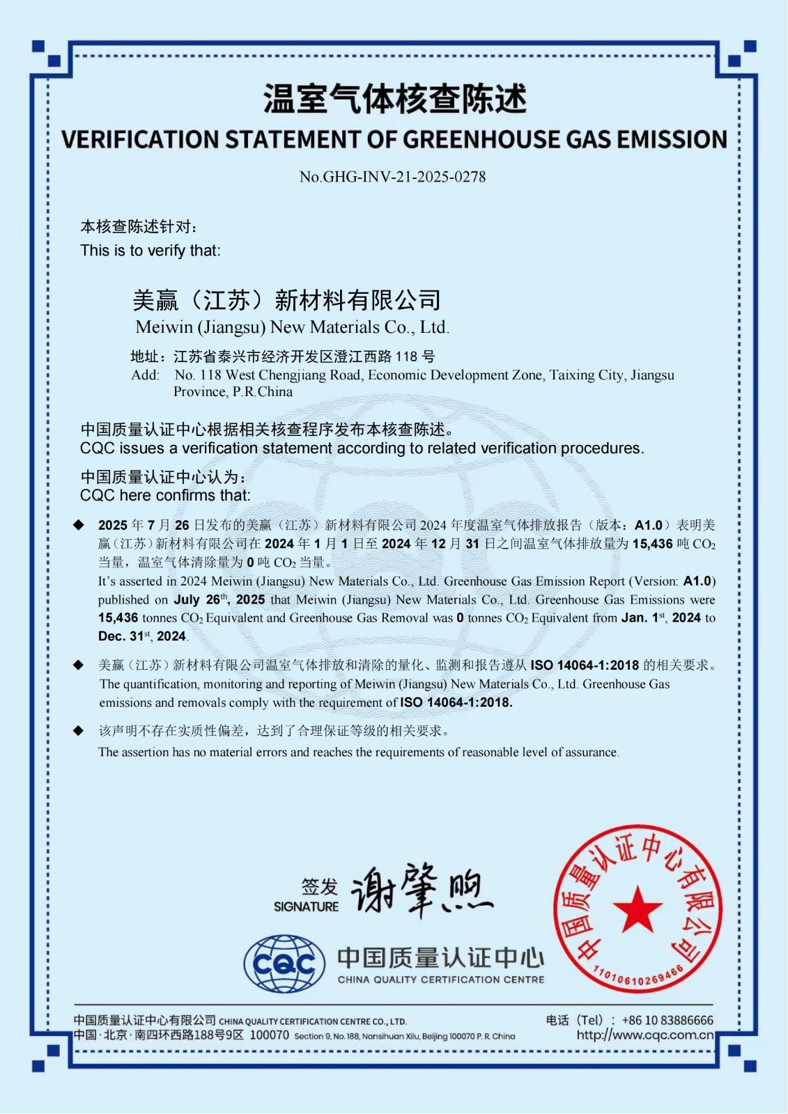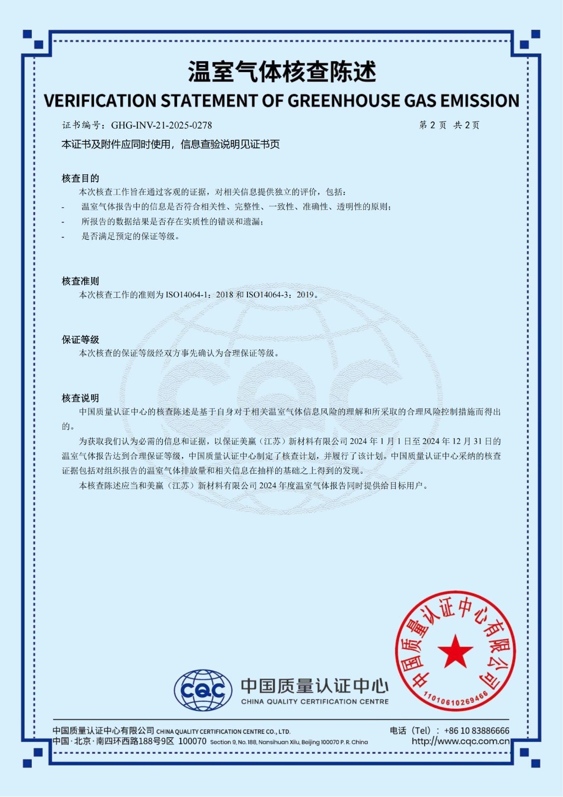 贏勝旗下全資子公司美贏(江蘇)新材料有限公司通過 CQC 溫室氣體核查陳述并獲得產品碳足跡認證